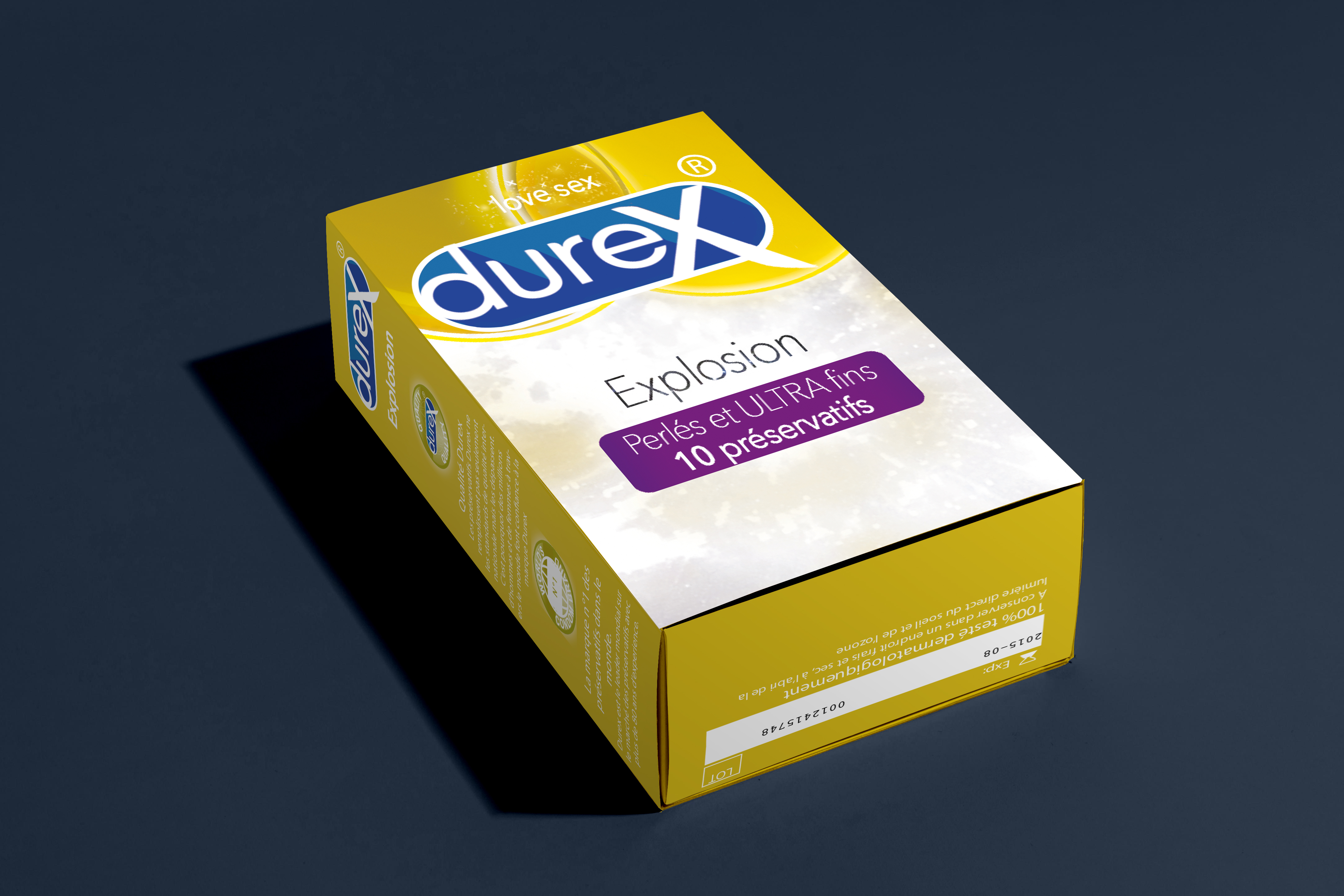 La conception a débuté avec la réinterprétation du logo Durex - à l'époque de la création du packaging, le logo était rectangulaire aux bords arrondies - suivi de la création de trois propositions de packaging. S'inspirant d'une nébuleuse, le design utilise une palette de couleurs dorées et blanches nacrées, évoquant à la fois l'élégance et la puissance d'une explosion cosmique. Le packaging, dans sa forme finale, contient 10 préservatifs perlés et ultra fins. L'aspect visuel du paquet avec le nom "Explosion" a été crée en utilisant la retouche d'image pour transformer une nébuleuse en un motif attrayant et pertinent.